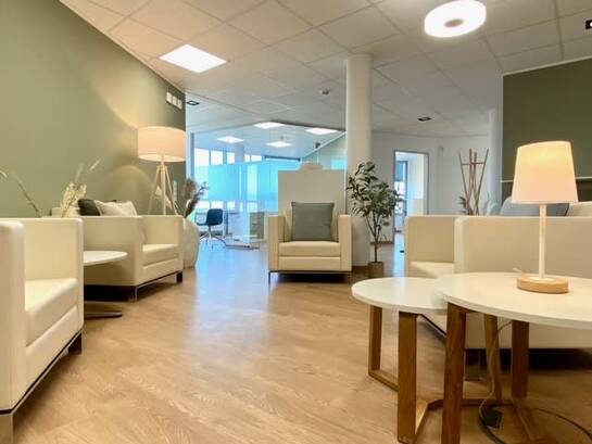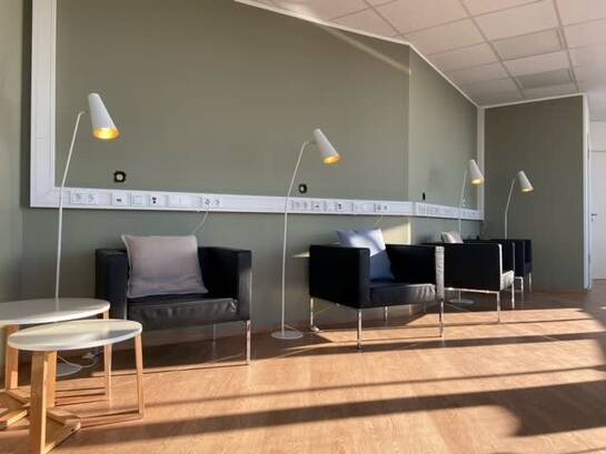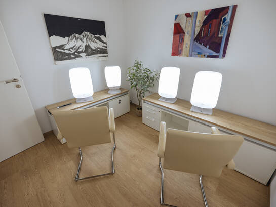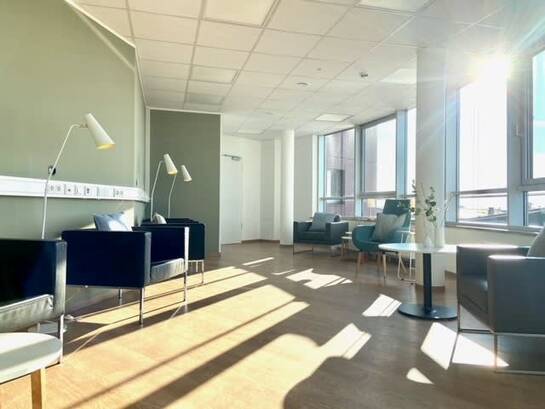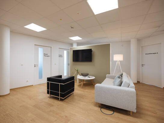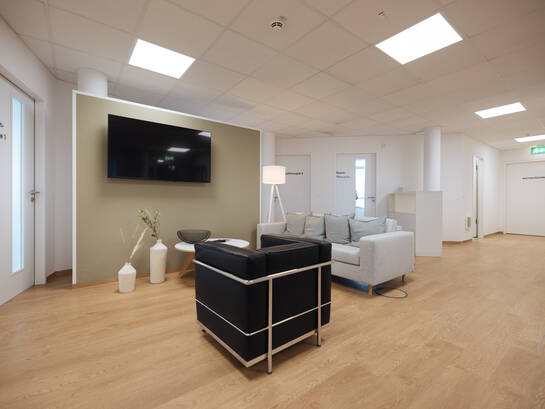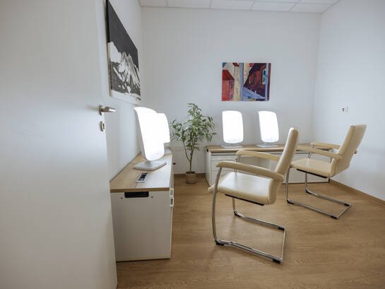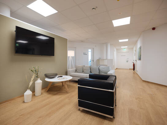 Die Ausstattung der Tagesklinik ist großzügig. In einer angenehmen Atmosphäre, in der sich Ihre Patienten wohlfühlen werden, stehen uns für therapeutische und außertherapeutische Aktivitäten neben fünf Einzeltherapie-Räumen, Untersuchungs- und Diagnostikräumen auch ein Fitnessraum und drei Gruppenräume zur Verfügung. Eine Patientenbibliothek, ein Leseraum, ein Musiktherapieraum, ein bestens ausgestatteter Kunsttherapieraum sowie eine großzügig bemessene Ruhezone bieten alle Voraussetzungen für eine Besserung oder Genesung.